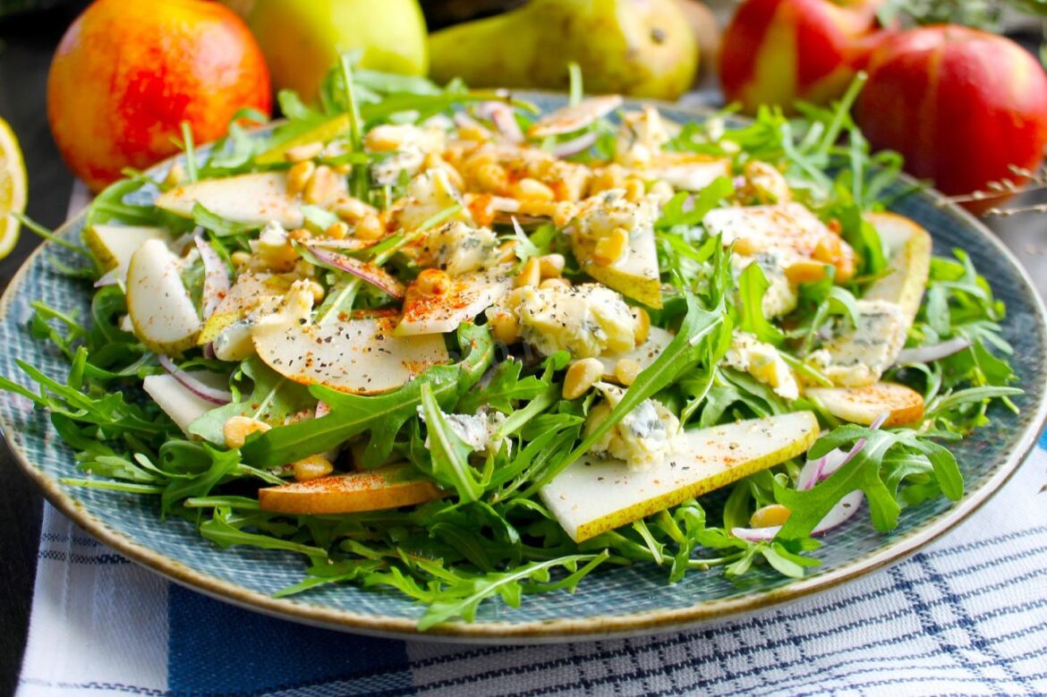 - On a serving plate, arrange the arugula. Top it with the caramelized pear slices, crumbled Gorgonzola cheese (or any other blue cheese), and toasted pine nuts.